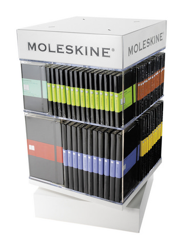 Plexiglass structure with 2 levels,one for the pocket sizeand one for the large size.Varnished woodenheader and base.The logo is printedon the 4 sides of the header.It holds up to 60 pocketand 44 large units.13 ¼" x 13 ¼" x h 23 ½"33.5 x 33.5 x h 60 cm.