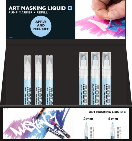 Molotow Art Masking 36pc Counter AssortmentAssortment Contains: 2 sku's36 pieces totalCardboard Counter Rack included at no charge with assortment purchaseRack Dimensions: 8.75"W x 9.25"H x 6"DShips from SLS Stock or Drop-Ships from the Manufacturer